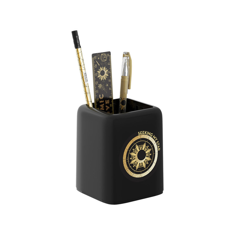 Готовый набор с наполнением. Стильная подставка с рисунком, нанесенным на термопленку. Изготовлена из высококачественного пластика. В комплекте 3 предмета из представленных коллекций: ручка, карандаш, линейка. Наполнение может отличаться от представленного.