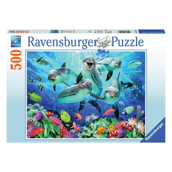 Пазл с изображением дельфинов, плавающих среди подводных рыбок и кораллов. Состоит из 500 деталей. Элементы изготовлены по технологии Softclick, плотно и легко соединяются друг с другом. Форма элементов уникальна и подходит для размещения только в определенном месте. Вырубка элементов сделана вручную.