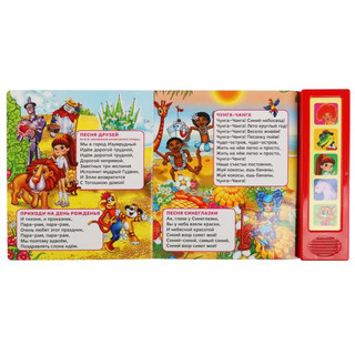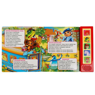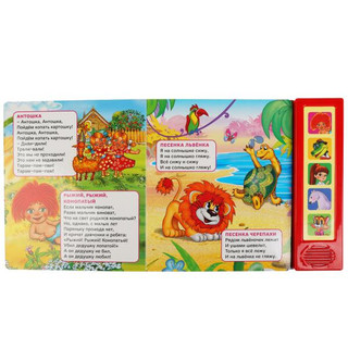 Малыш с удовольствием будет листать плотные страницы, рассматривать яркие иллюстрации, нажимать на звуковые кнопки и слушать весёлые песенки. На одной звуковой кнопке располагается по 4 песни. Благодаря удобному формату книгу можно взять с собой в дорогу.