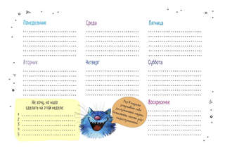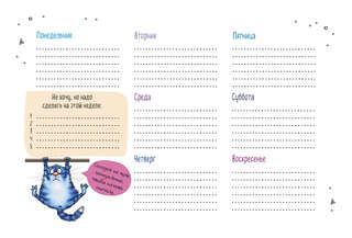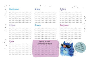 С ним организация рабочих и личных дел превратится в сплошное удовольствие! Озорные синие коты, которых придумала и нарисовала известная художница Рина Зенюк, будут сопровождать вас каждую неделю, делясь саркастичными, но в то же время мудрыми мыслями. Заготовленные котами шаблоны для ведения записей не только помогут упорядочить мысли и планы, но и подарят заряд позитива.