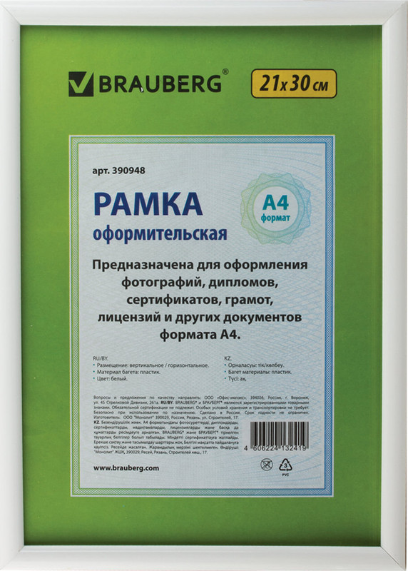Рамка используется для оформления фотографий, дипломов, сертификатов, грамот, лицензий и других документов формата А4. Возможность вертикального и горизонтального подвеса.