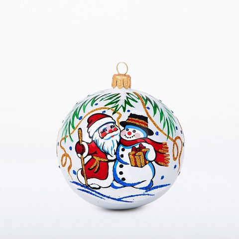 Стеклянный елочный шар «Морозный день» выполнен из стекла, декорирован ручной росписью. Рисунок — Дед Мороз и Снеговик. Диаметр шара 8.5 см.