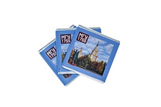 Миниатюрная плитка молочного шоколада квадратной формы. На обёртке картина с изображением осенней аллеи на фоне главного здания МГУ.
