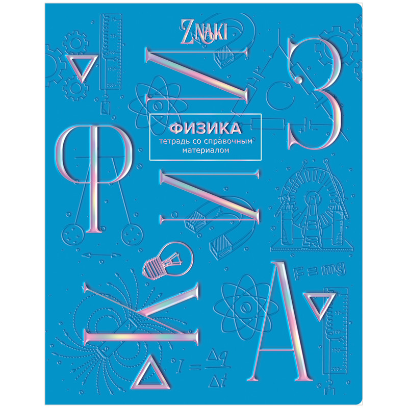 Тетрадь предметная «Физика» из серии «Znaki» со справочной информацией на титульном листе, запечатанный оборот. Формат А5. Вид крепления — скрепка. Обложка — мелованный картон с тиснением голографической фольгой, скругленные углы. Внутренний блок — 48 листов, офсет 60 г/м2, клетка с полями.