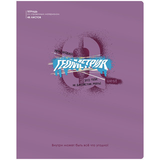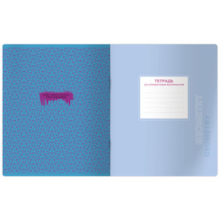 Тетрадь предметная «Геометрия» из серии «Квест» со справочной информацией на форзаце и титульном листе. Формат А5. Вид крепления — скрепка. Обложка — печать металлизированным пантоном, мелованный картон с выборочным лаком, скругленные углы. Внутренний блок — 48 листов, офсет 60 г/м2, клетка с полями.