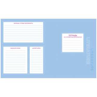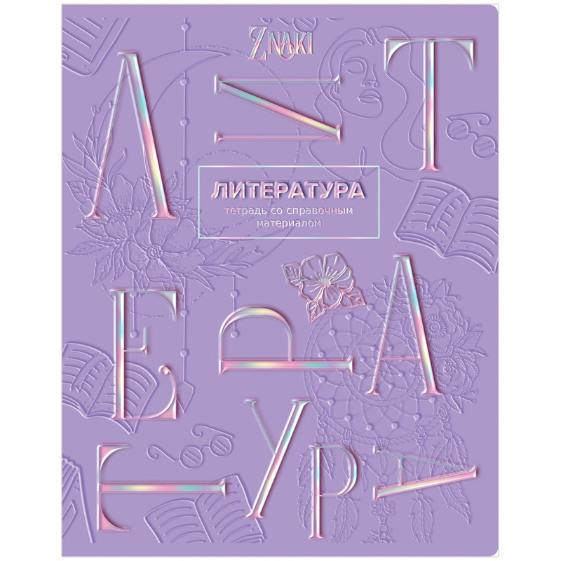 Тетрадь предметная «Литература» из серии «Znaki» со справочной информацией на титульном листе, запечатанный оборот. Формат А5. Вид крепления — скрепка. Обложка — мелованный картон с тиснением голографической фольгой, скругленные углы. Внутренний блок — 48 листов, офсет 60 г/м2, линия с полями.
