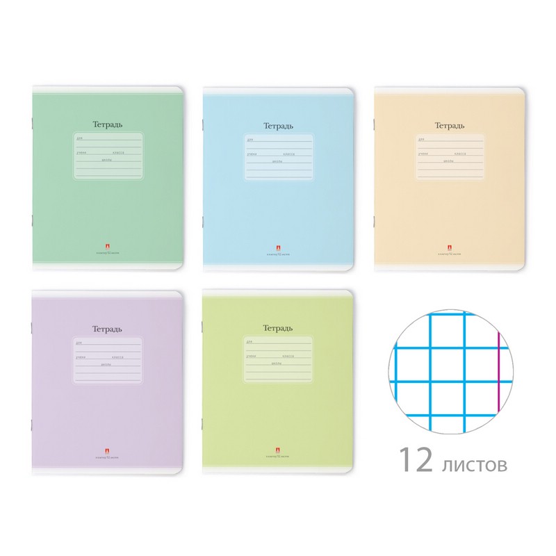 Дизайн тетради краткий и лаконичный, не вызовет осуждающий взгляд даже со стороны самого строго учителя. В наборе 5 цветов: зеленый, бежевый, лимонный, фиолетовый, голубой. Обложки выполнены из высококачественного мелованного картона 190 г/кв.м. На внешней стороне обложки находится поле для персональных данных школьника. Блок — 12 листов в клетку, изготовлен из высококачественной офсетной бумаги плотностью 60 грамм. Блок фиксируется скрепками. Линовка и поля совпадают с лицевой и оборотной сторонами листа. Скругленная форма уголков обложки снижает риск залома. Разметка страниц — классическая клетка, поля выделены красным.