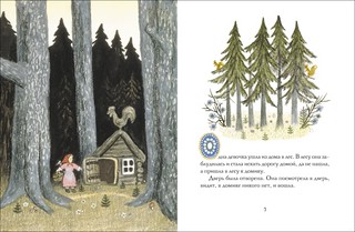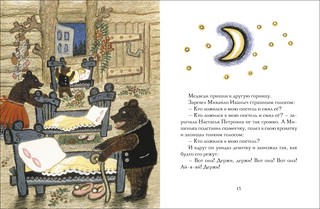 Чудесные иллюстрации Юрия Васнецова — крупные, но с привлекательными деталями: вот Мишутка, чтобы не потеряться в лесу, ухватился за завязки передника Настасьи Петровны; вот Маша лихо раскачалась на Мишенькином стульчике, а из лукошка выпадают грибы. Миски расписные, ложки резные, у каждой кровати по половичку и даже тапочки с помпонами. И гроздья рябины со связками грибов развешаны по медвежьему дому — видимо запасы к холодам.