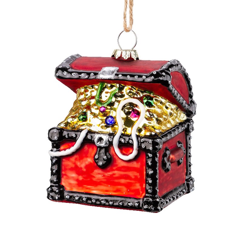 Сундук, полный сокровищ, станет особым украшением на праздничной елке! Крупная елочная игрушка выполнена из стекла высокого качества, детали искусно прорисованы. Сверкающие краски добавляют атмосферу волшебства и праздника. Изделие является относительно тяжелым, предпочтительно использование на искусственной елке.