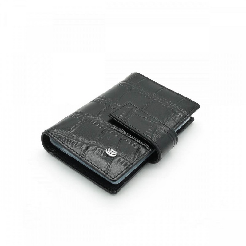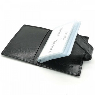 Стильная визитница из натуральной кожи черного цвета, закрывается на кнопку. Внутри 20 прозрачных кармашков и два потайных кармана.