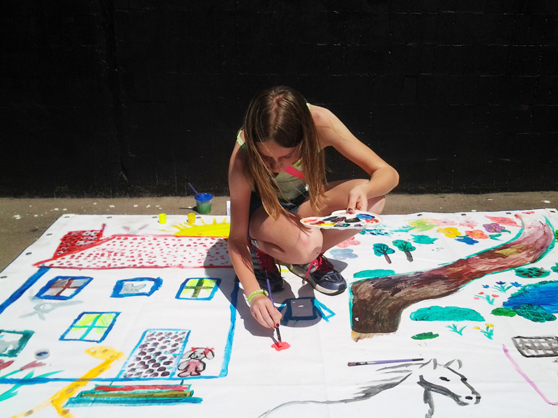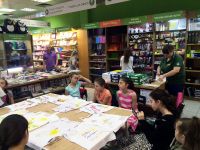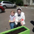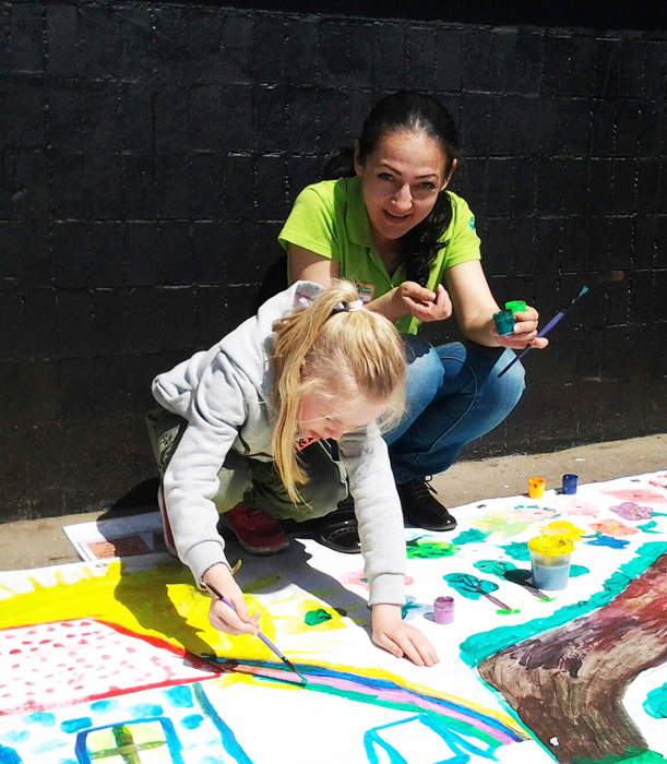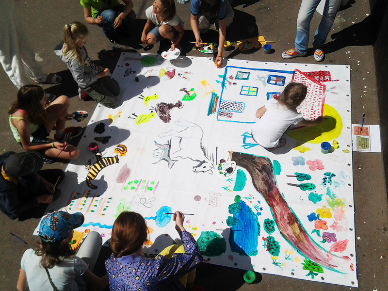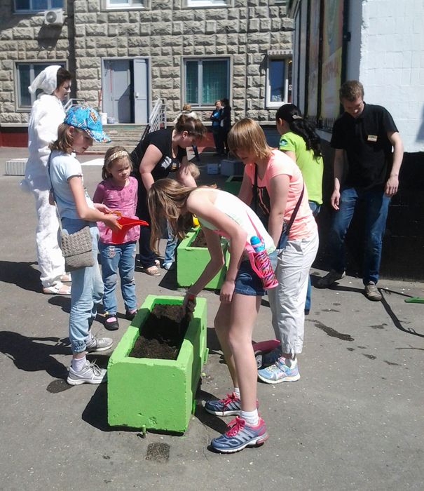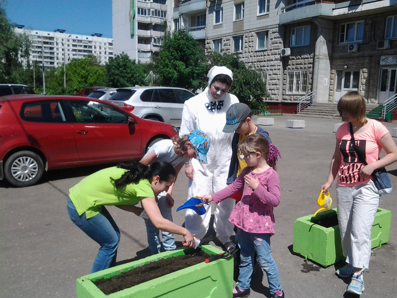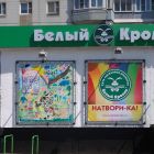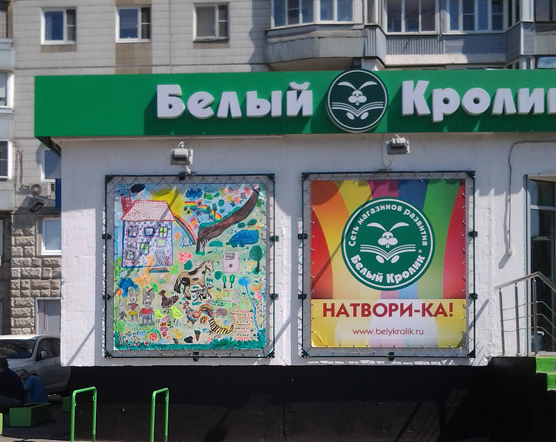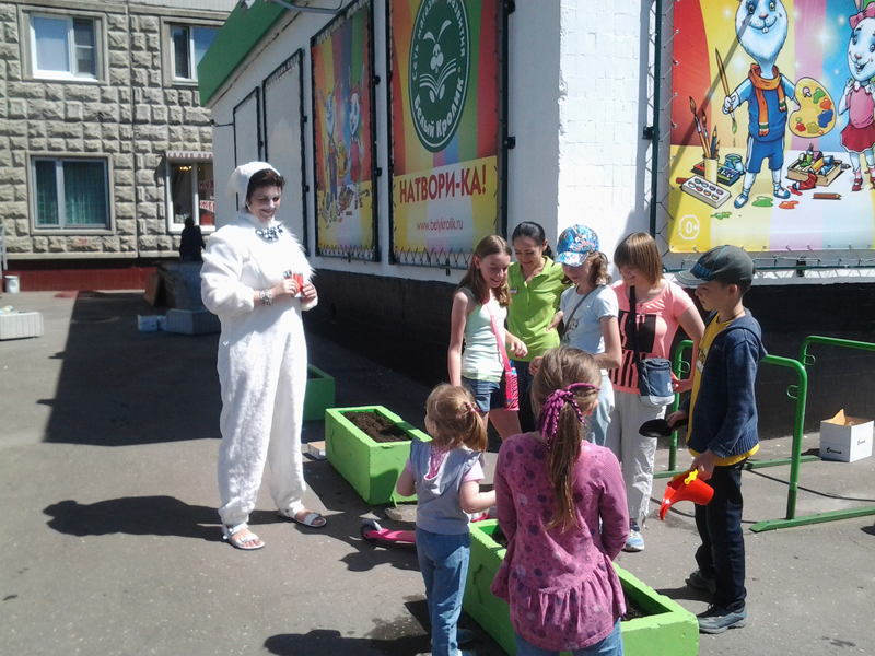 А в магазине на Мичуринском ребята нарисовали настоящую витрину для «Белого Кролика»! После посадки морковки на клумбах у входа, мы расстелили баннер и акриловыми красками нарисовали для Белого Кролика домик. А чтобы ему там не было скучно, дорисовали друзей =)