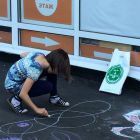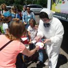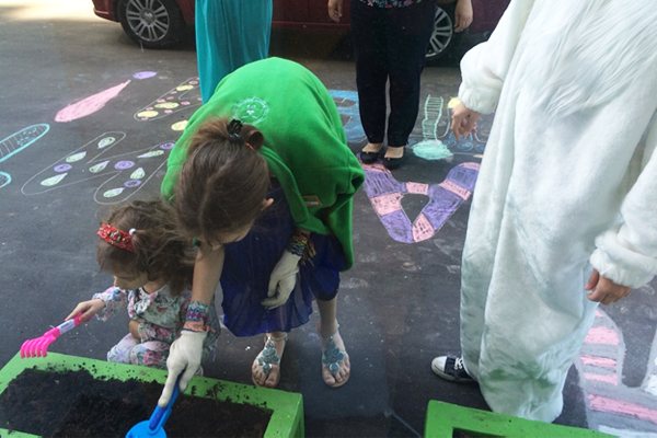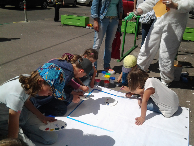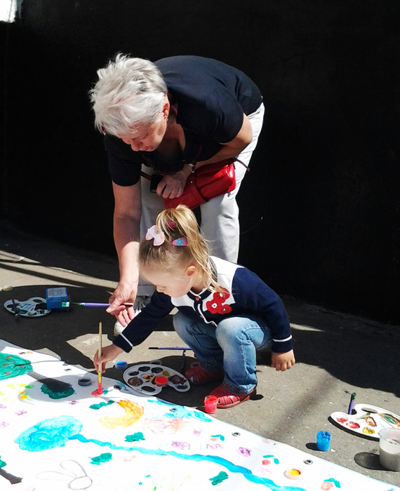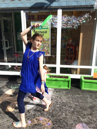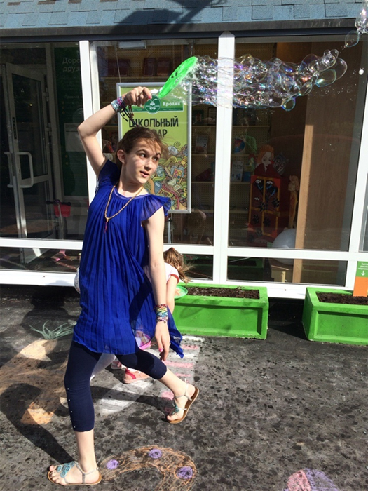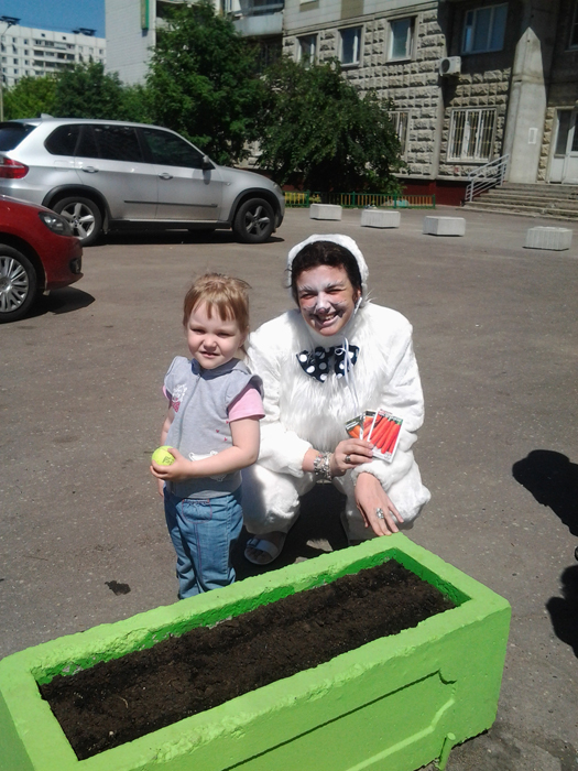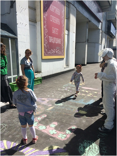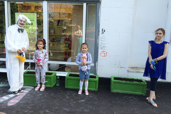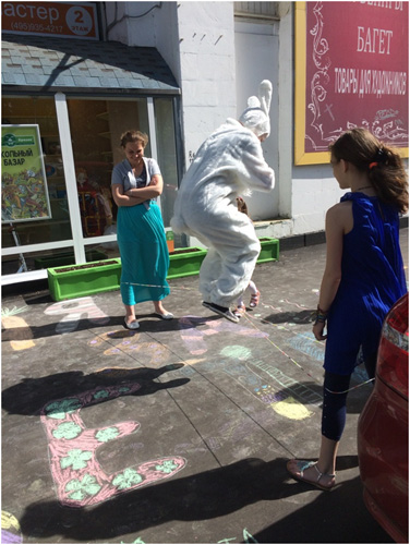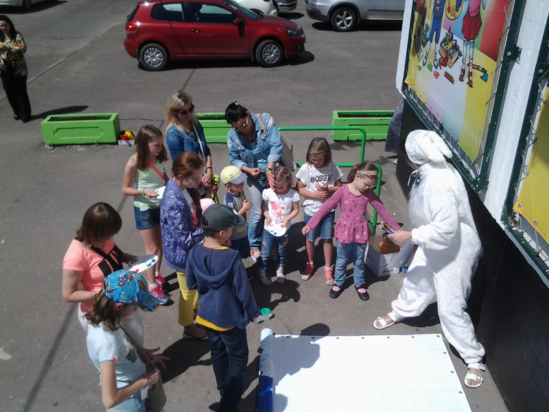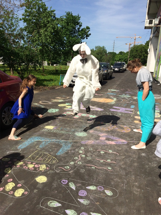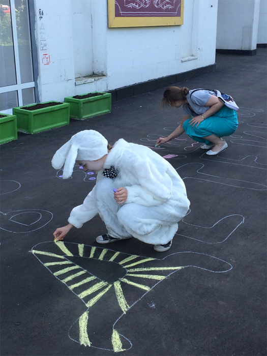 Вместе с Белым Кроликом мы не только нарядно разрисовали асфальт перед входом в магазин, но и запускали космические мыльные пузыри, сажали морковку и играли в наши любимые настольные игры.