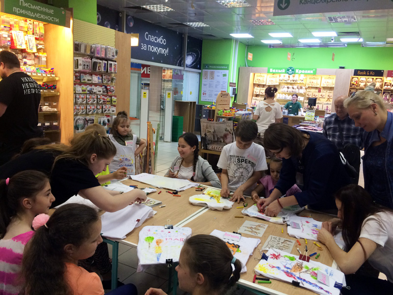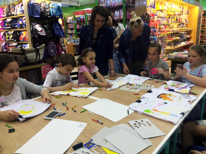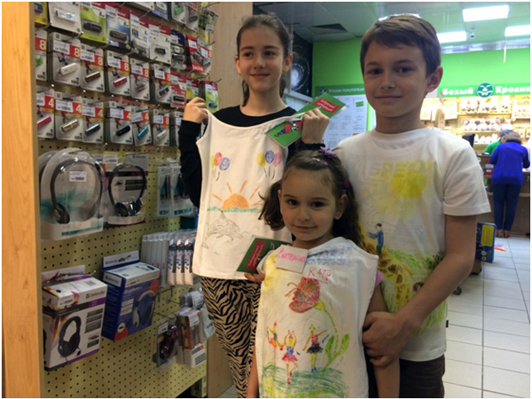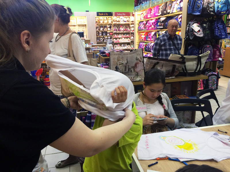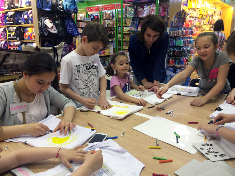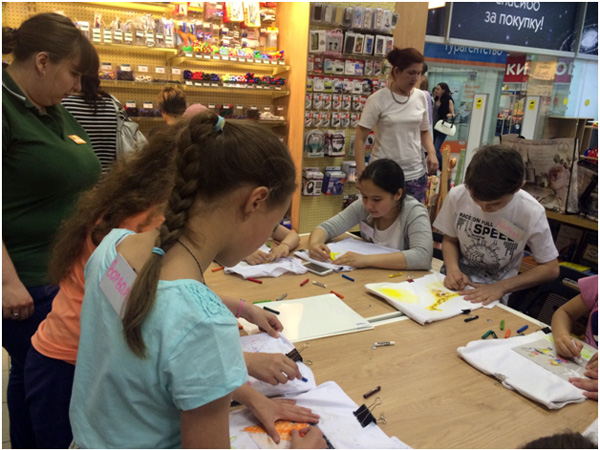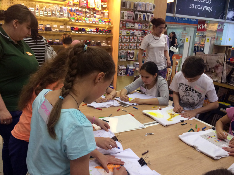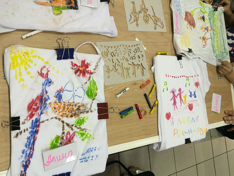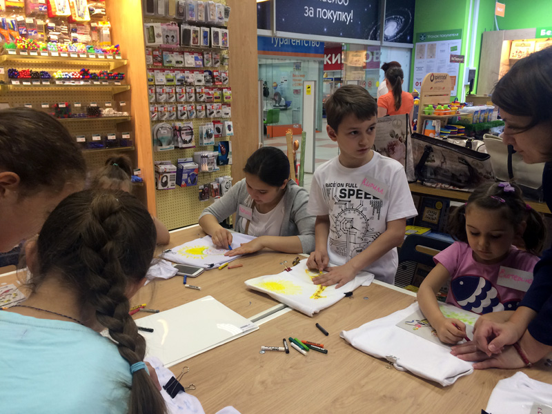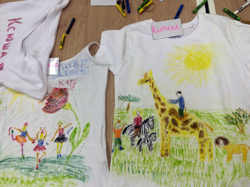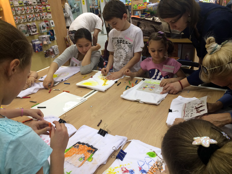 В День Защиты Детей в магазине на Новых Черёмушках мы решили провести не совсем обычный мастер-класс. Что в нём особенного? То, что на этом занятии мы не учили и не подсказывали, а просто раздали ребятам белые футболки, пастель, трафареты и предоставили полную свободу творчества.