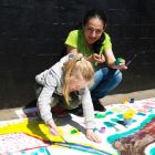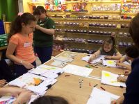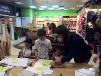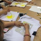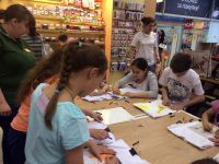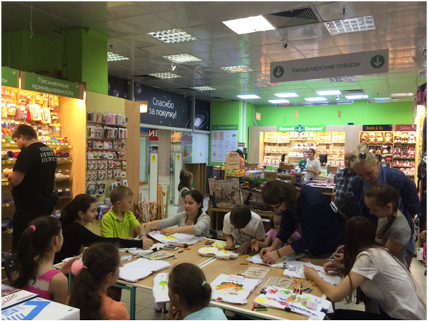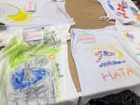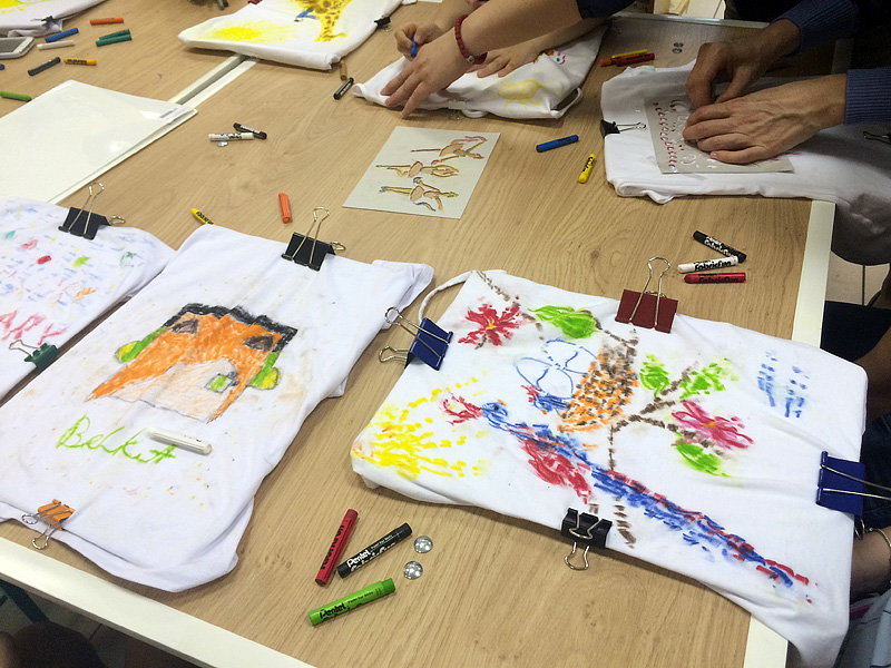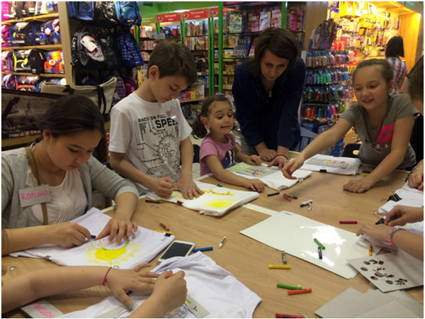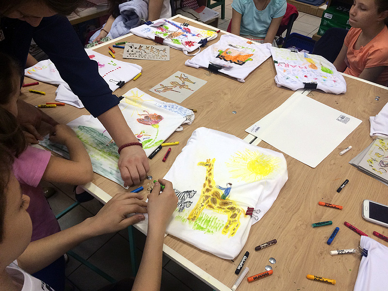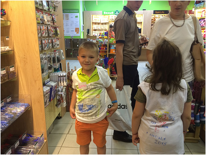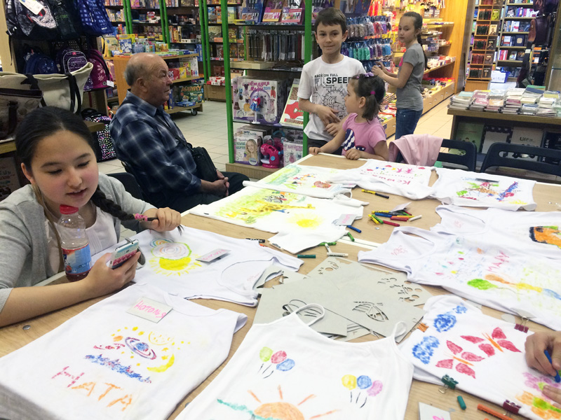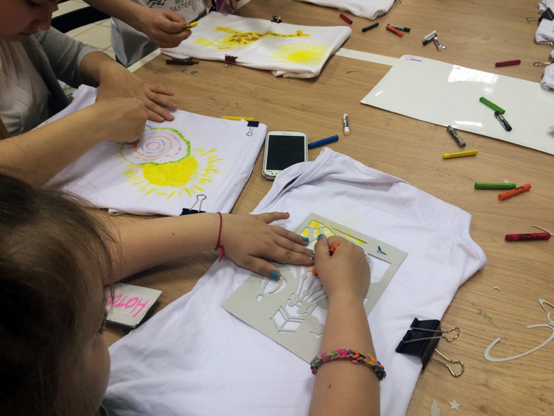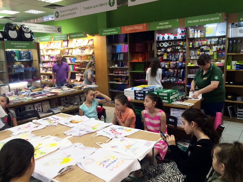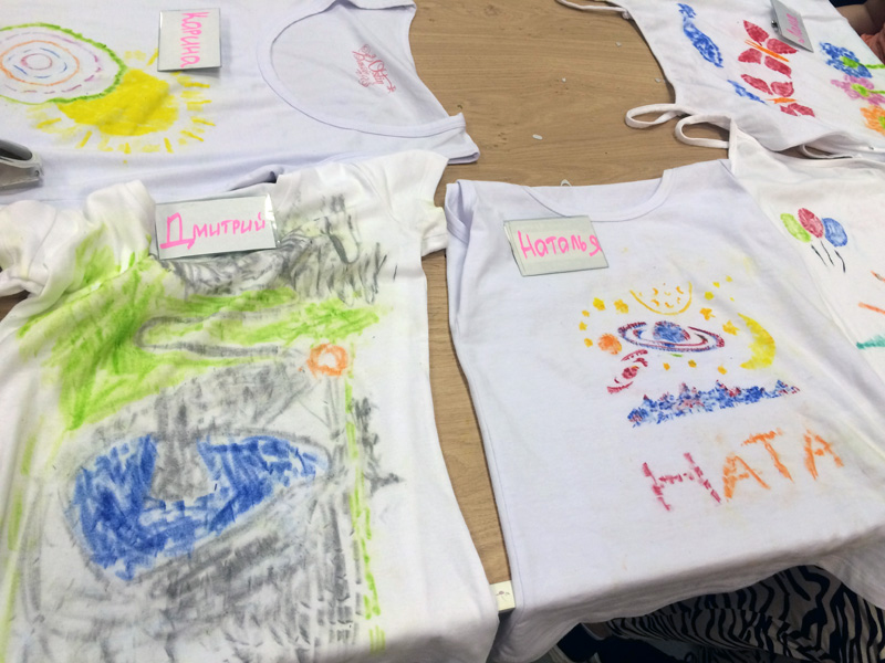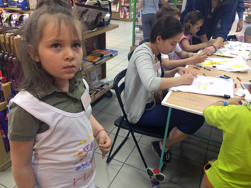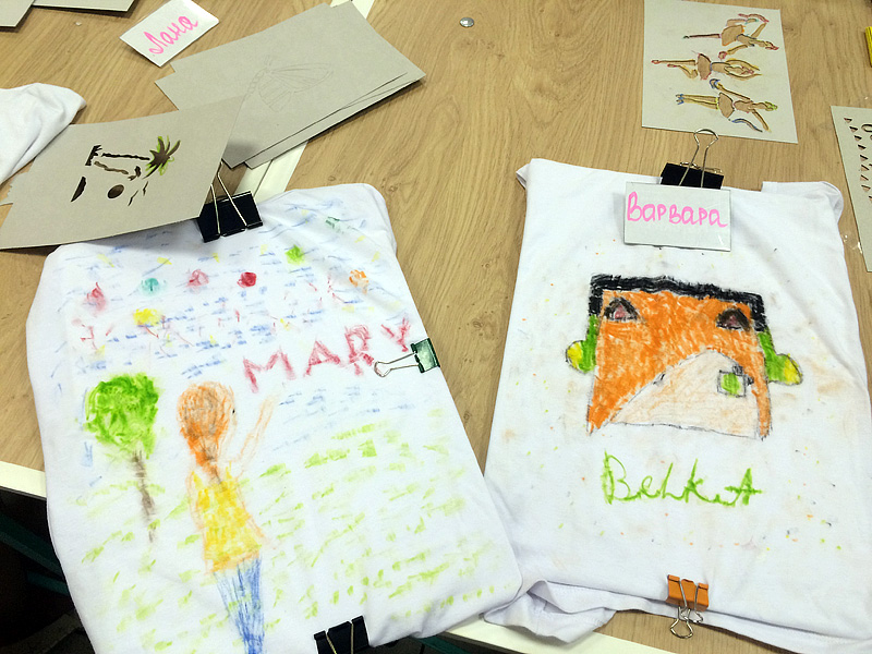 В День Защиты Детей в магазине на Новых Черёмушках мы решили провести не совсем обычный мастер-класс. Что в нём особенного? То, что на этом занятии мы не учили и не подсказывали, а просто раздали ребятам белые футболки, пастель, трафареты и предоставили полную свободу творчества.
