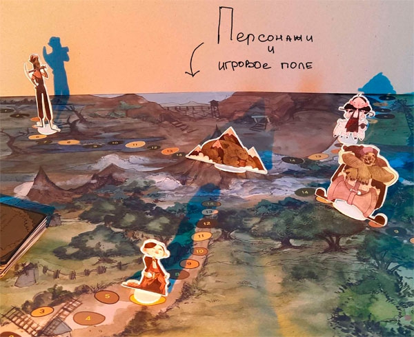 Что же здесь происходит?- Игровое поле состоит из четырёх зон, по одной на каждого игрока. Болото, шахты, дремучий лес и путь через поля. Цель игроков — достичь скалистых гор где их ждет сокровище!