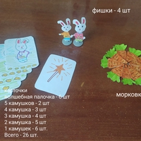 Правила и условия: Классическая «ходилка» с кубиком и фишками в виде белых кроликов с различным цветом глаз, дополнительные правила расположены на игровом поле.
