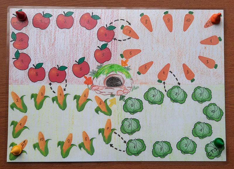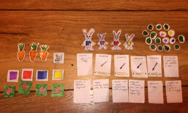 Игра Кролозож на конкурс настольных игр, 2023В игре также есть физические упражнения на каждом шаге из морковки определённого цвета и вида, чтобы игроки не засиживались за столом.