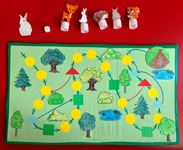 Правила игры: Каждый игрок выбирает одну игровую фигурку (животного) и ставит её на позицию Старт на игровом поле. Право первого хода предоставляется игроку, отгадавшему загадку о животном, далее продолжают игроки по часовой стрелке. Одна геометрическая фигура один ход.