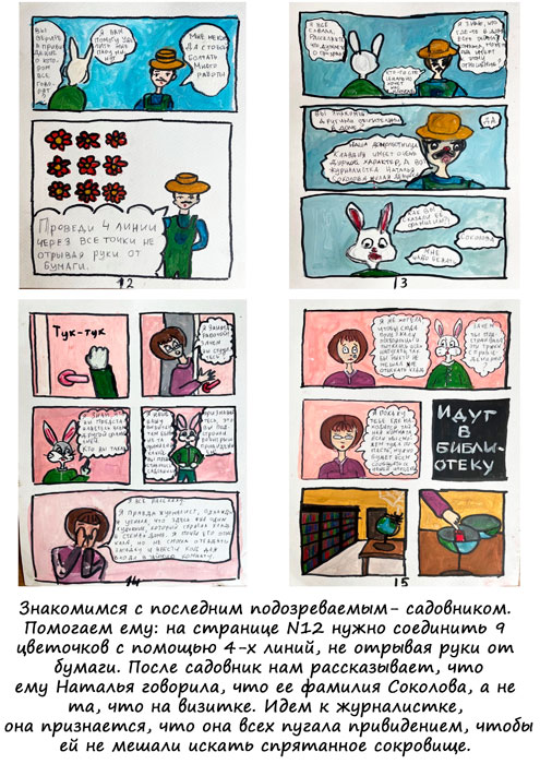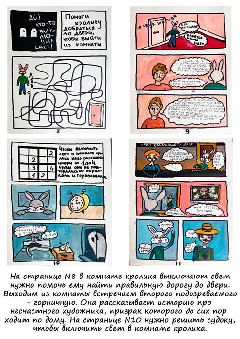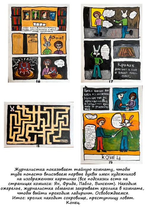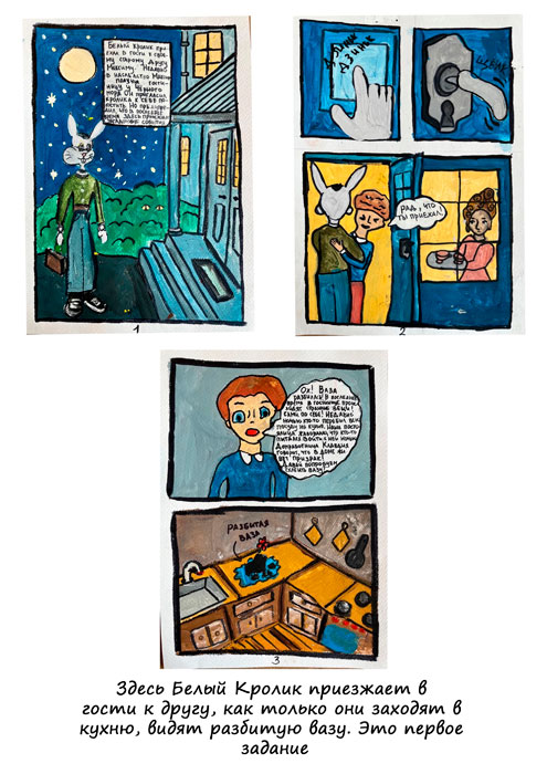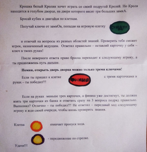 • Всю информацию о придуманной вами настольной игре: название, описание, правила и условия, количество игроков, рисунок/схемы/карточки и/или другие необходимые материалы в виде текста и фотографий. Не забудьте, что Белый Кролик обязательно должен присутствовать в вашей игре!