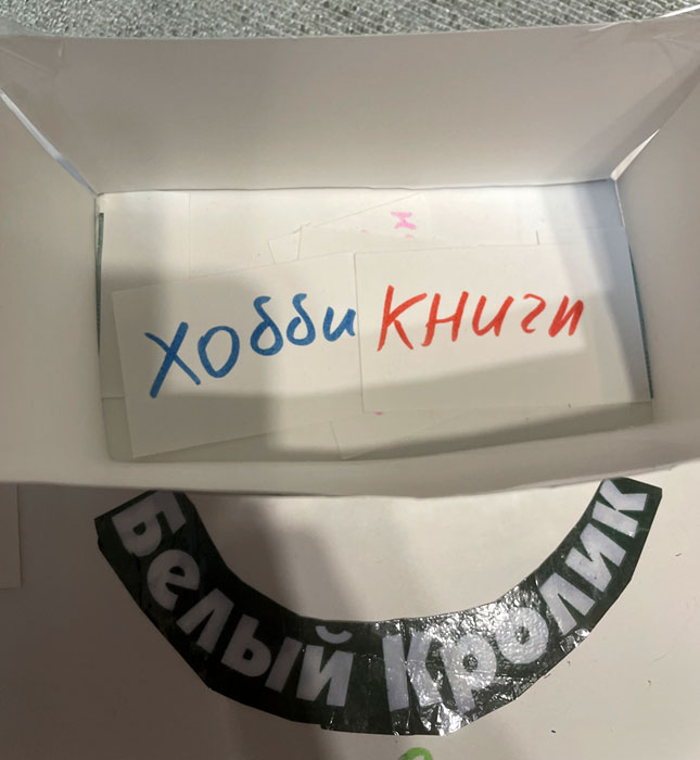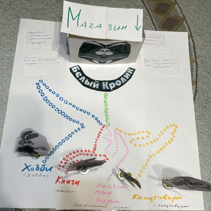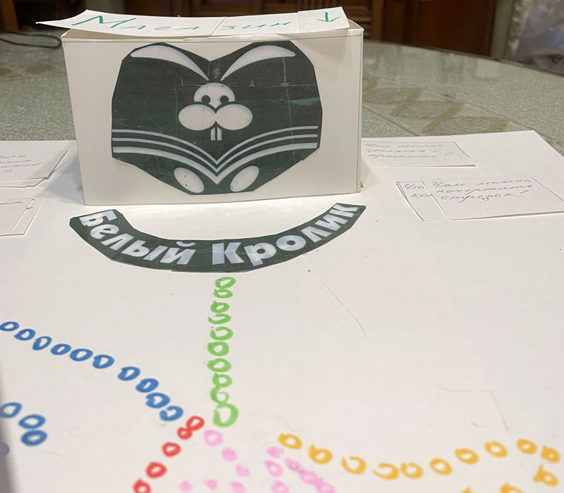 На игровом поле есть объёмная модель магазина Белый Кролик. В нём лежат карточки с разделами, игрок с закрытыми глазами выбирает рандомную карточку, карточка с каким разделом ему выпадет, по тому пути он будет идти всю игру.