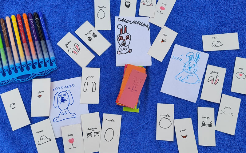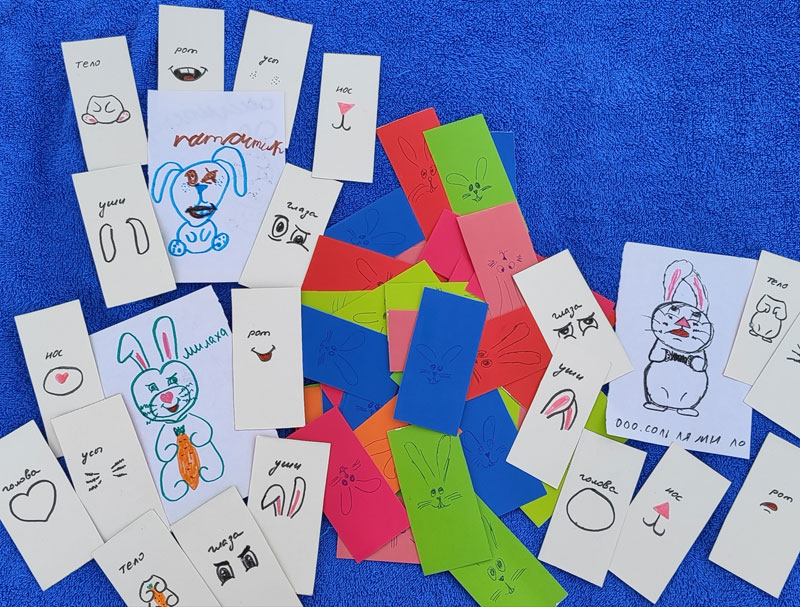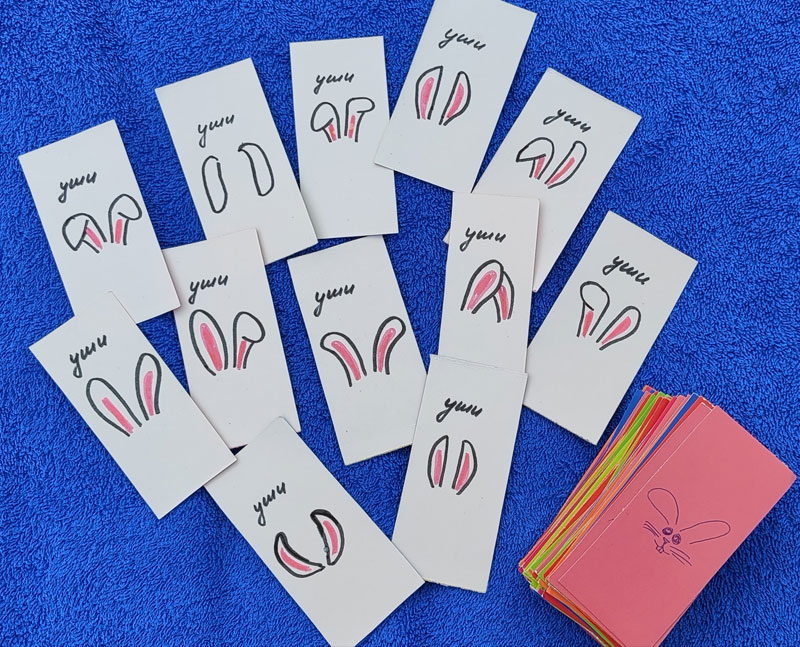 Кролик на оси вращается и морковкой указывает на карточки с заданиями, которые располагаются в случайном порядке: