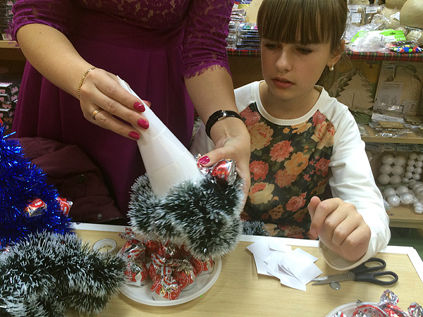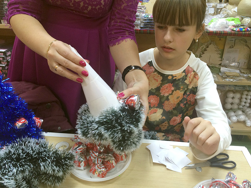 Ёлочка, которую мы задумали, — не простой сувенир. Сделана эта лесная красавица своими руками, а значит, хранит тепло и любовь своего мастера. А украшена ёлочка не шарами и игрушками, а вкусными шоколадными конфетами! Мммммм!..
