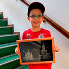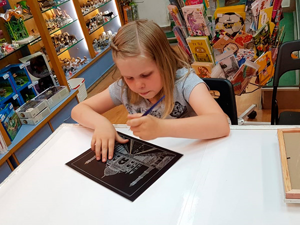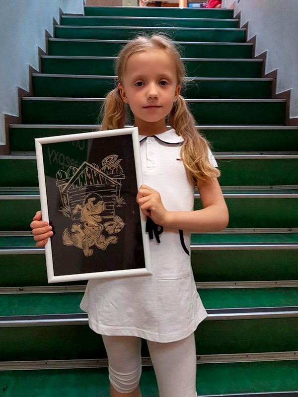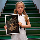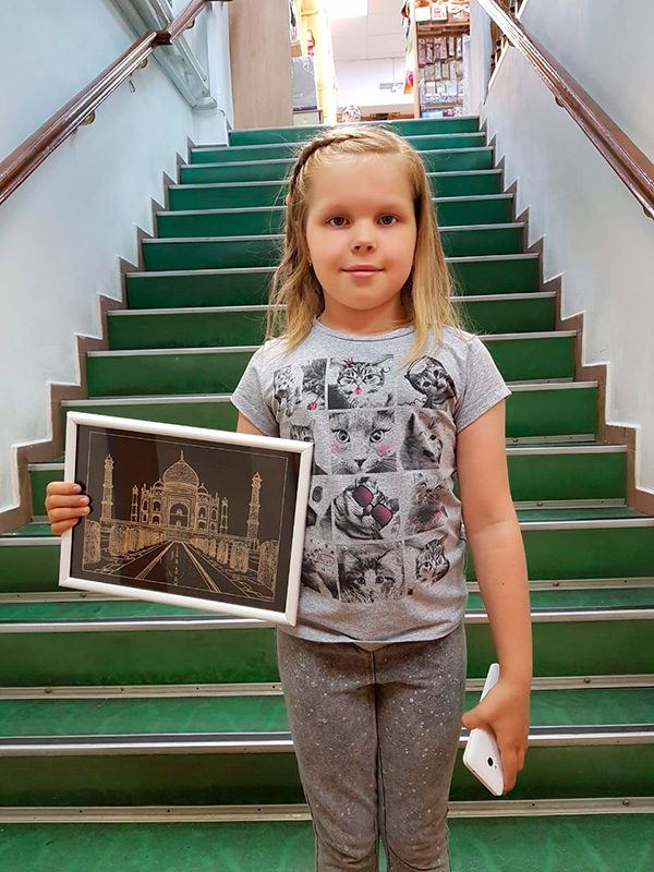На занятии у все детей был незаменимый помощник — штихель. Это не знаменитый художник, а специальный инструмент. С его помощью с заготовки снимается защитный слой и появляется рисунок серебряного или золотого цвета.
