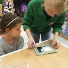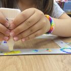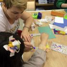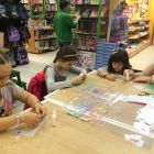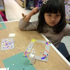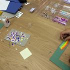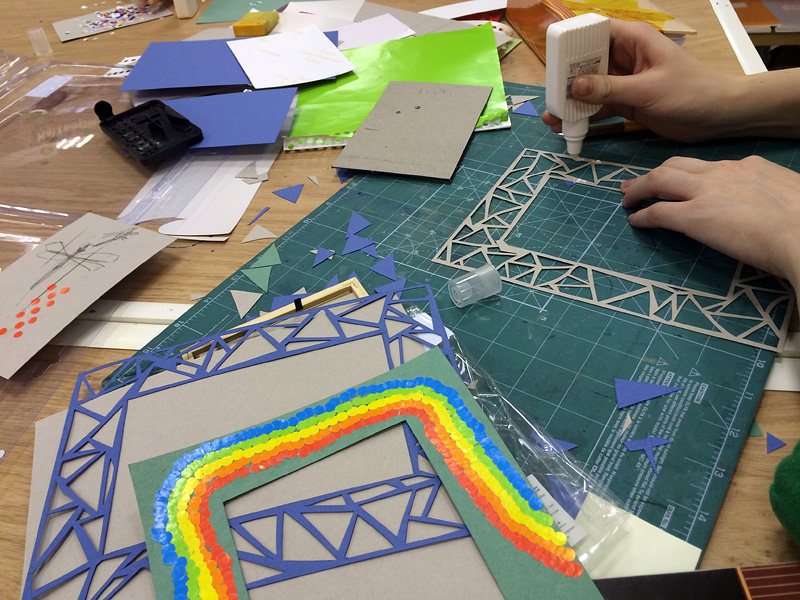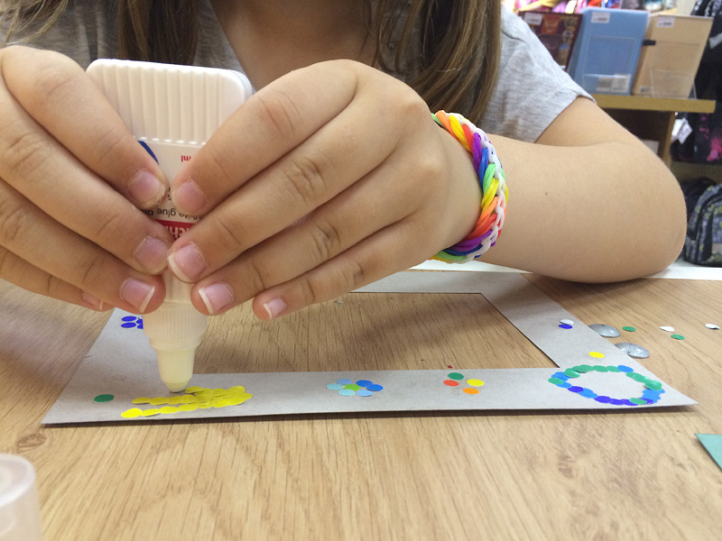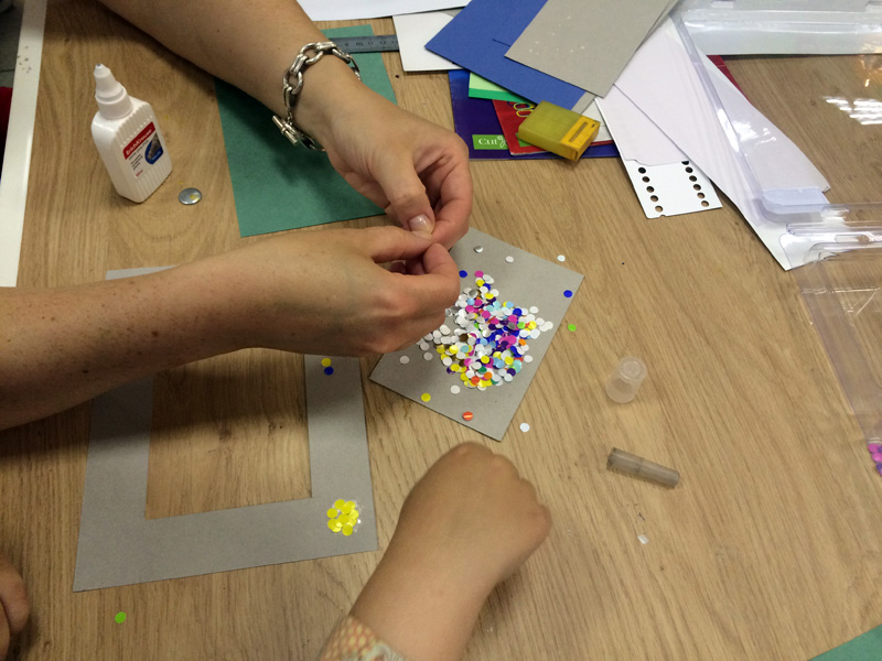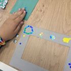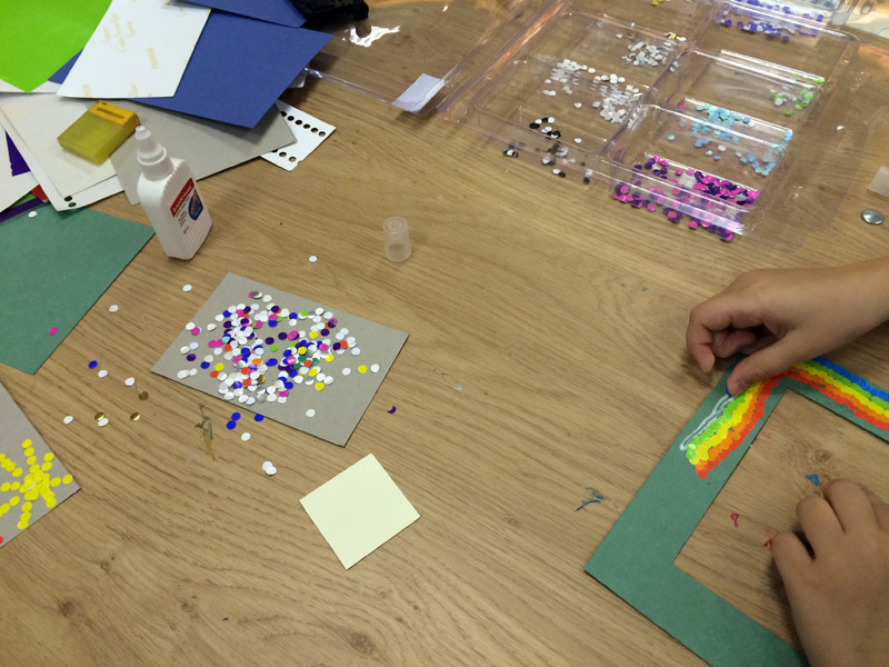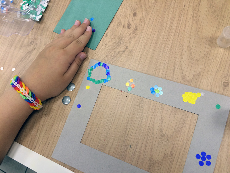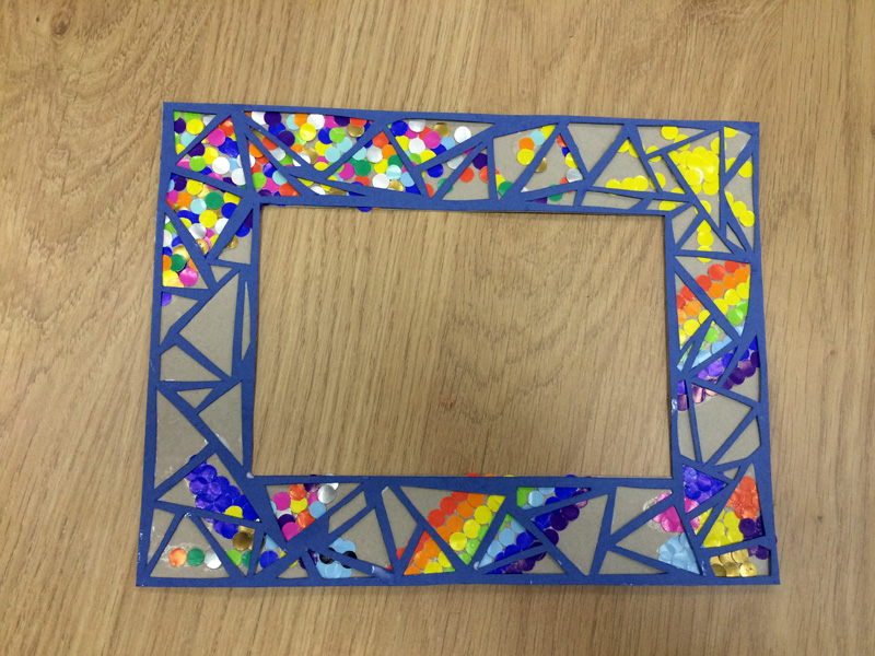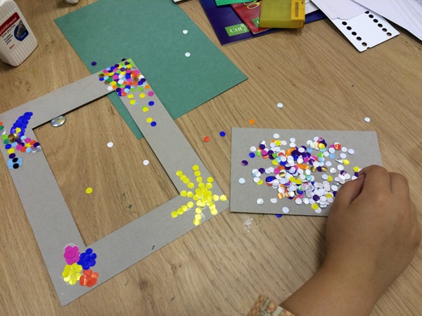Создание такой фото-рамки напоминает мозаику: кропотливо ребята выбирали конфетти нужного цвета и наклеивали их на картонную основу. Получались рисунки и просто красочная абстракция.