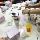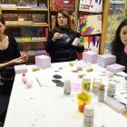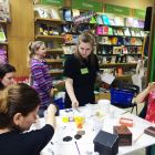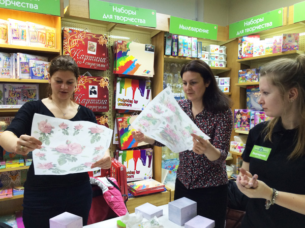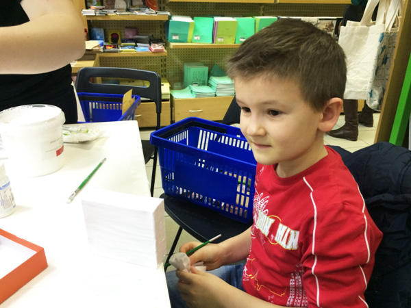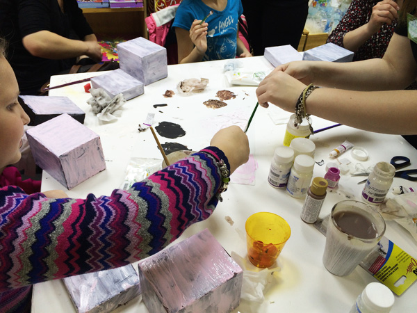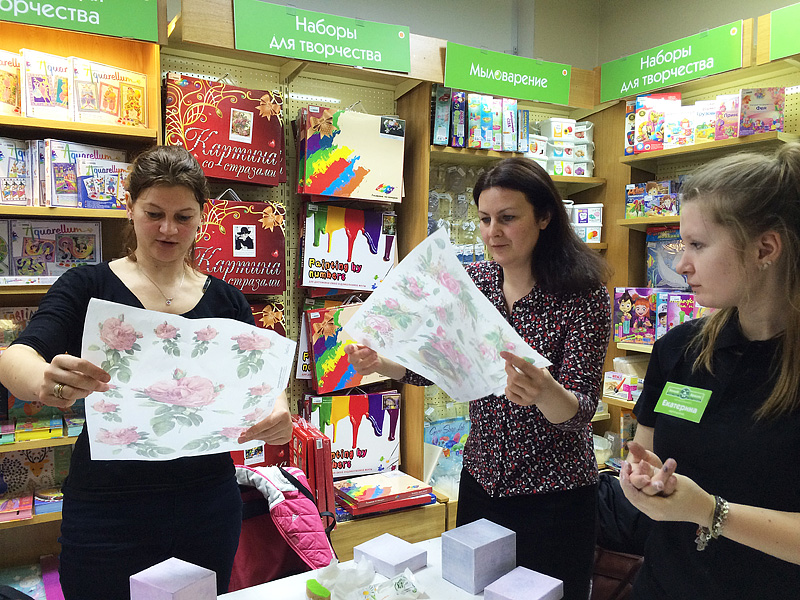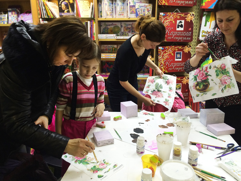 Слои красок, шлифовка воском для придания текстуры, смачивание губкой и вот, наконец, можно выбирать рисунок с декупажной салфетки! Все этапы работ выполнены на отлично, немного уставшие, но счастливые и довольные маленькие и взрослые мастера отправляются по домам с новыми красивыми цветочными шкатулками.