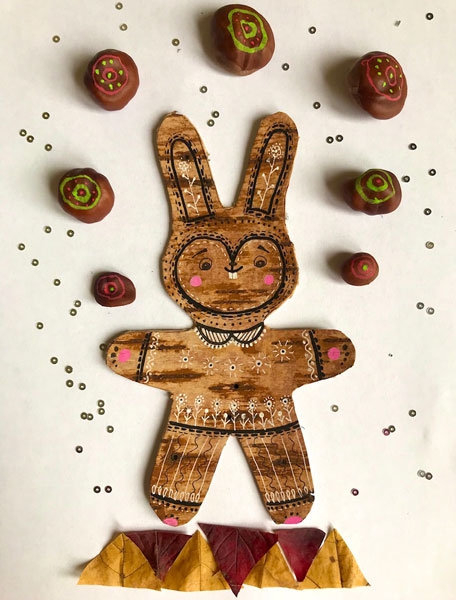 Кролик нарисован на берёзовой коре и жонглирует каштанамиХрипченко Григорий, 12 лет, и Хрипченко Мария, 6 лет. Камышовый кролик