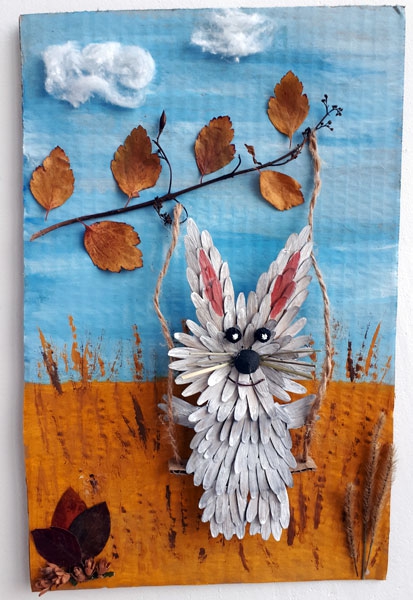 Кролик качается на качели и наслаждается теплой осенней погодой. Выполнен из семян ясеняРезник Данил, 12 лет, Резник Кирилл, 2 года. Кроличья поляна