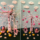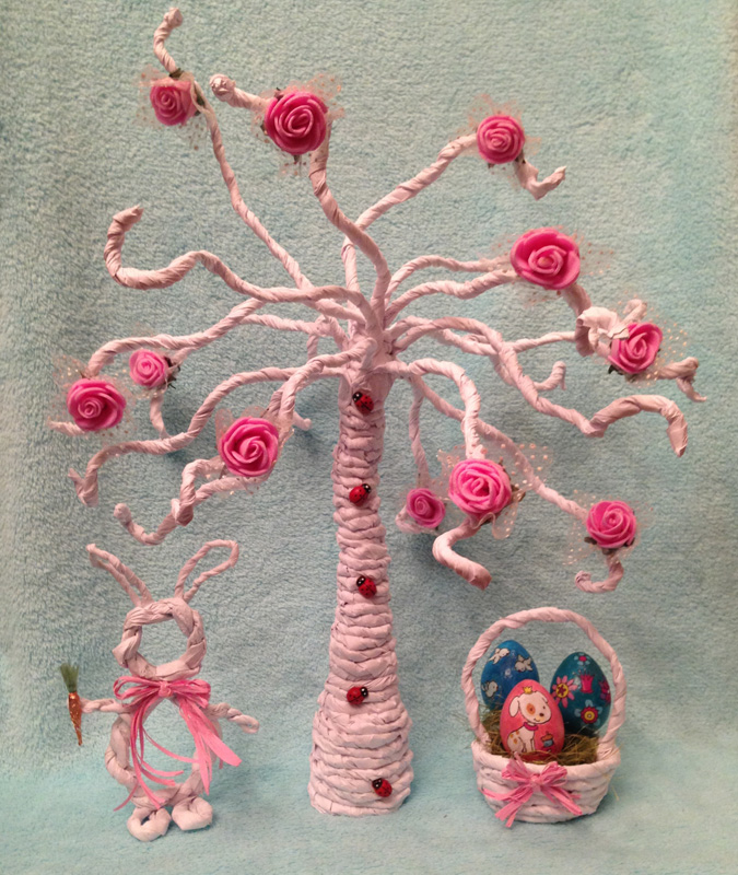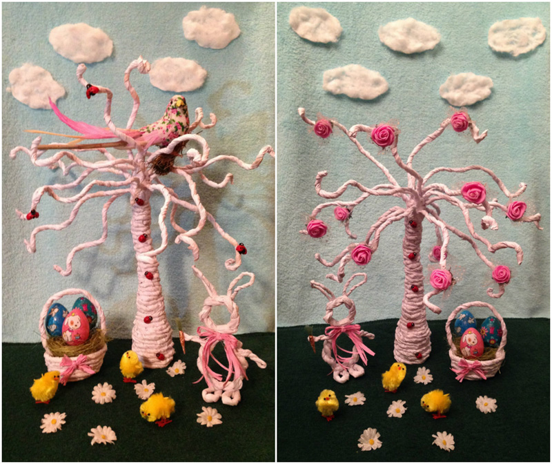 Ваше пасхальное дерево нас очень впечатлило! Яйца украшены в технике декупаж, дерево и кролик скручены из обычной бумаги, розочки сделаны из войлока, ромашки из ткани, облака из ваты.