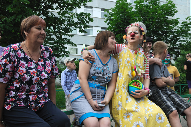 Настоящее веселье началось, когда появились яркие клоуны, окружённые облаками мыльных пузырей. Великолепная, очень профессиональная и дико смешная команда клоунов волонтёрского движения «Доктор Клоун» с первых же минут праздника захватила инициативу. Больше ребята не скучали ни секунды!
