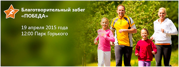 В преддверии 70-й годовщины со дня Победы в Великой Отечественной войне, 19 апреля в 12:00 в парке Горького состоится яркий спортивный праздник — благотворительный забег «Победа». Организатором мероприятия стал фонд «Старость в радость», все собранные средства будут направлены в три дома престарелых с целью улучшения жизни одиноких пожилых людей, инвалидов и ветеранов.