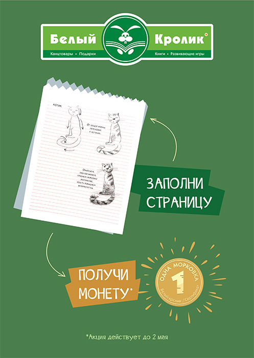Совершая любую покупку в наших магазинах, вы получаете страницу из блокнота. Забирайте странички домой, заполняйте и приносите обратно — монетка-морковка гарантирована!