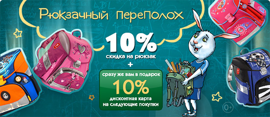 Теперь при покупке любого ранца в «Белом Кролике» мы дарим вам дисконтную карту с максимальной скидкой! Вы можете оформить карту постоянного клиента со скидкой 10% на кассе. Эта скидка будет действовать сразу же, ранец будет стоить на 10% дешевле!